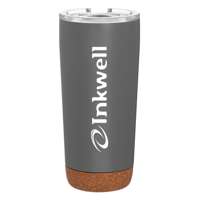 20 oz double wall 18/8 stainless steel thermal tumbler with copper vacuum insulation, clear push-on lid with sliding closure, and synthetic cork base · gift box included